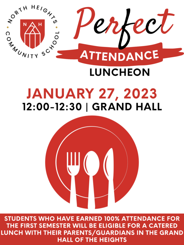 Friday, January 27, students who have earned perfect attendance for the semester will be invited, along with their families, for a catered lunch in our grand hall.